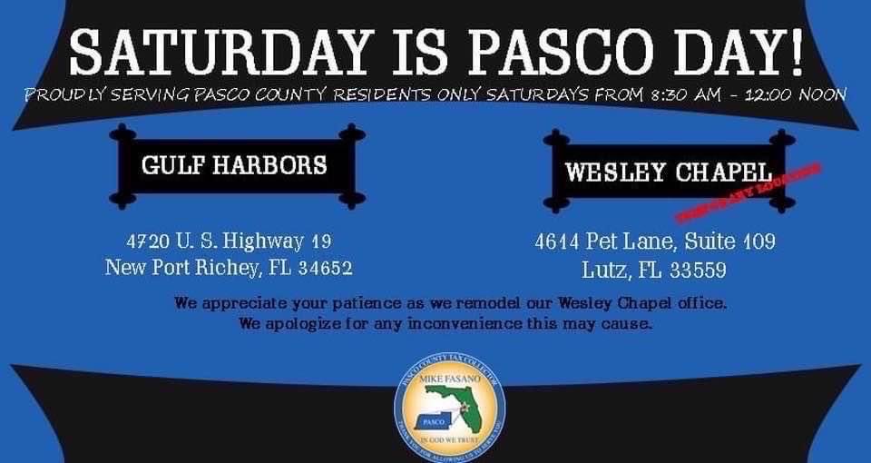 On July 11 2022 the current office of the Pasco County Tax Collectors Office will move one building down to 4614 Pet Lane Suite 109 Lutz FL 33559. Port Richey 3 miles Elfers 3 miles. You can find Pasco County Tax Collector in New Port Richey on Pasco Little Road 7530 number in street.